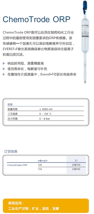ChemoTrode ORP是可以應用在制藥和化工行業(yè)過程中的最耐受苛刻測量要求的ORP傳感器。該傳感器有一個加液孔可以添加電解液并可外加壓,,EVEREF-F參比系統(tǒng)確保參比電解液保持無銀離子和蛋白質沉淀。
