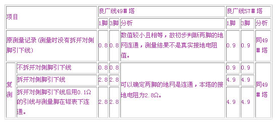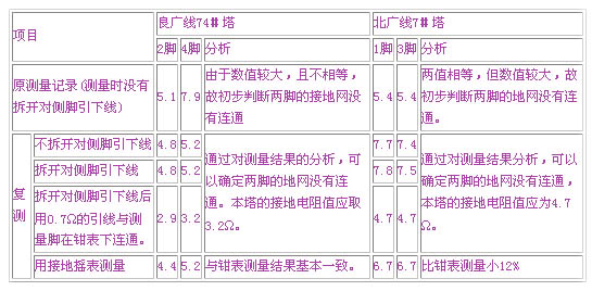 我們復測了110kV良廣線74#塔北廣線7#塔的接地電阻結果如表1所示: